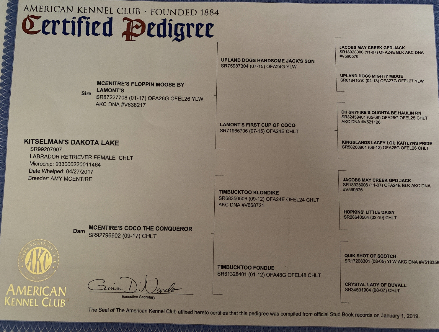OFA's LR-EL100869F24-VPI, LR-252419E24F-VPI Interesting facts about Abbey.... Abbey is daughter to Dakota, granddaughter to Coco, niece to Wiggles and cousins with Pepper amd Beebee. She was called honey for her first 2 months of life because of how sweet she is. Abbey has inherited Coco's love to snuggle! This girl takes cuddle time extremely serious! She is extremely loyal and protective. Abbey weighs about 80 lbs.