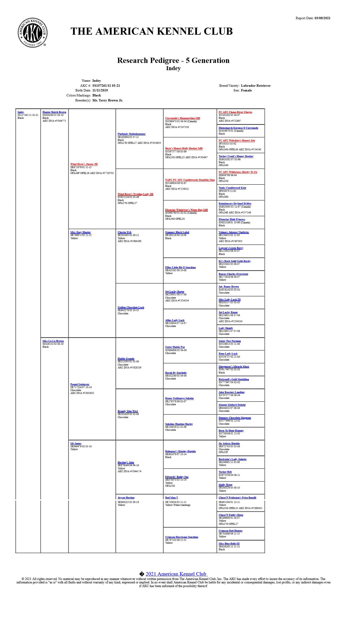 Indey has been tested for all the common Labrador Retriever diseases plus another 150 things they test for and doesn't present with any diseases, but is a carrier for EIC. Her offspring may be carriers as well and should only be breed to another dog that test clear on those genes.